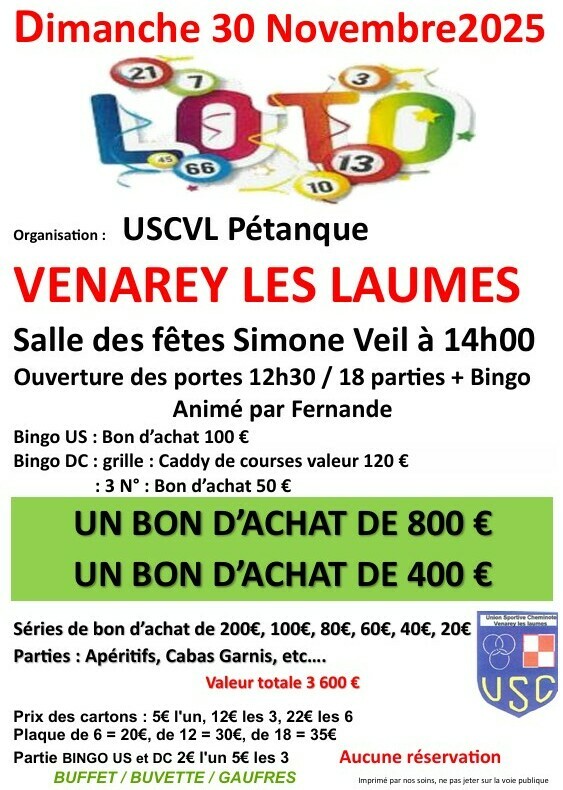 Le club organisera son loto le dimanche 30 novembre à la salle Simone VEIL à VENAREY LES LAUMES
